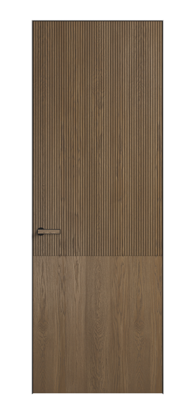 Это полотна с рельефной фрезеровкой. Этот прием делает интерьер объемным, тактильным, вносит интересную текстуру и создает современный образ. Волнистый рельеф может быть выполнен по ламелям из массива дуба в древесных матовых отделках, либо исполнен по натуральному и экологически безопасному материалу — ХДФ, покрытому гладкой эмалью актуальных оттенков.